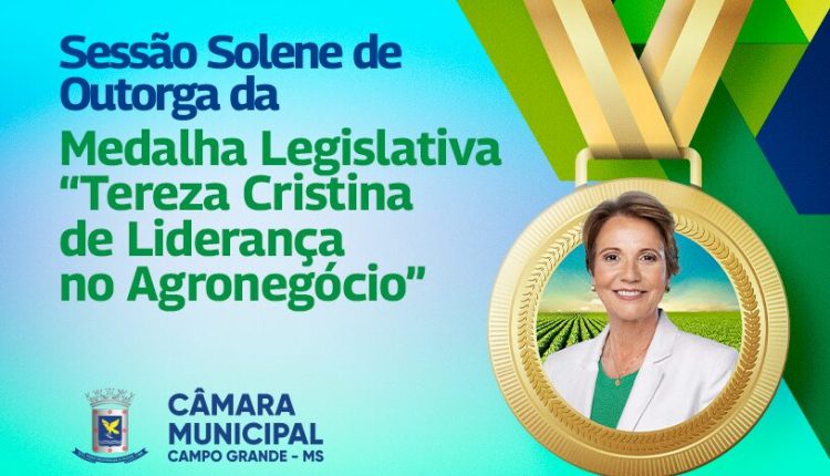 A Câmara Municipal de Campo Grande promove, nesta quinta-feira, dia 10, Sessão Solene de outorga da Medalha Tereza Cristina de Liderança no Agronegócio. O evento acontece a partir das 16 horas, no estande da Casa de Leis na Expogrande, no Parque de Exposições Laucídio Coelho.